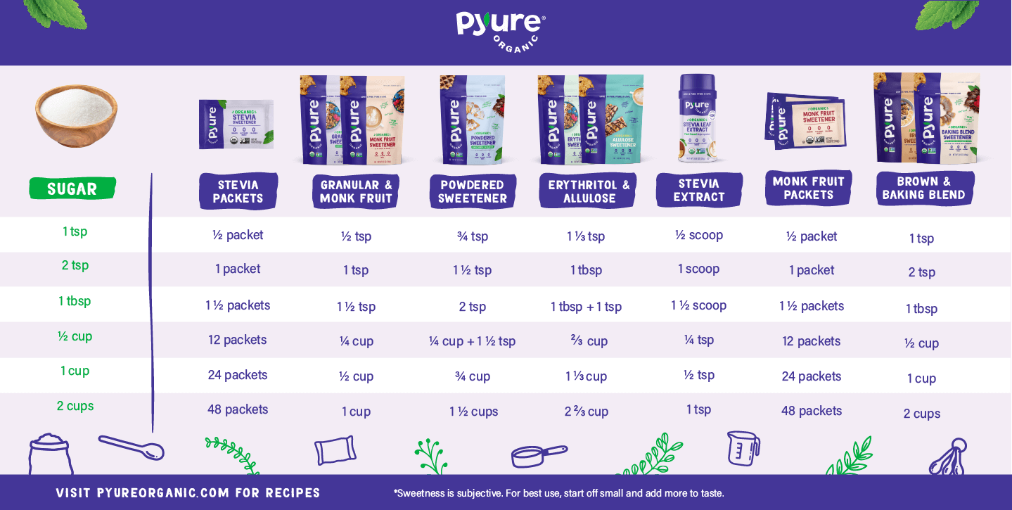 From table-top sweeteners, to liquids, extracts and bulk stevia blends, all Pyure products are excellent for cooking or baking your favorite sugar free or low-sugar recipes. You can substitute Pyure Organic Sweeteners for all or part of the sugar your recipes call for. Use our easy-to-use conversion chart to help with the substitutions.
